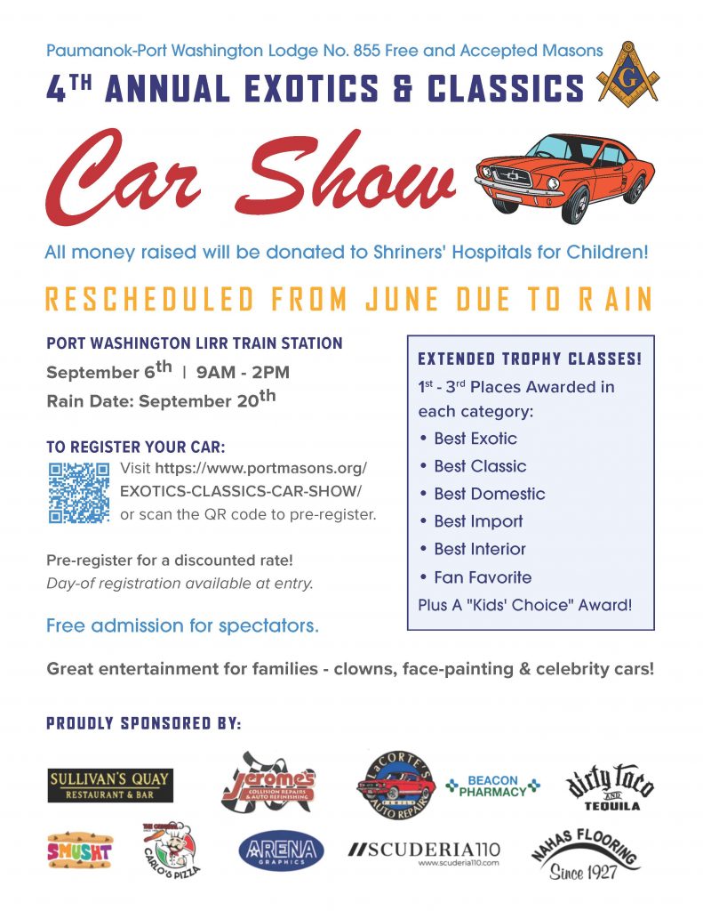 Paumanok-Port Washington Lodge announces its fourth annual Exotics & Classics Car Show which will take place at Port Washington Long Island Railroad Station East Parking Lot located off of South Bayles Ave. to the East of the Railroad Station. The show will take place on Saturday, September 6 with a rain date of Sunday, September 20, 2025, from 9 am to 2 pm.